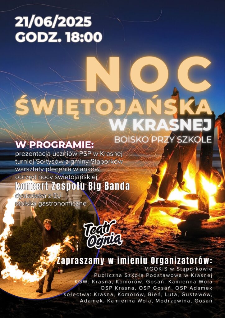 Serdecznie zapraszamy wszystkich mieszkańców Gminy Stąporków, powiatu koneckiego oraz ościennych gmin, a także gości z województwa świętokrzyskiego i całej Polski na wyjątkową plenerową imprezę„Noc Świętojańska w Krasnej”!